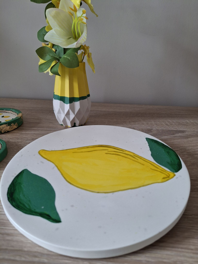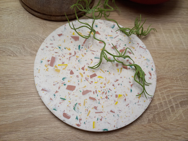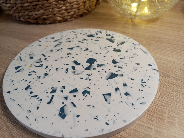 Dessous de plat rond en jesmonite au style terrazzo, fait main. Le design unique présente un mélange de fragments bleu marine ou multicolore dans un fond blanc créant une esthétique moderne et élégante.