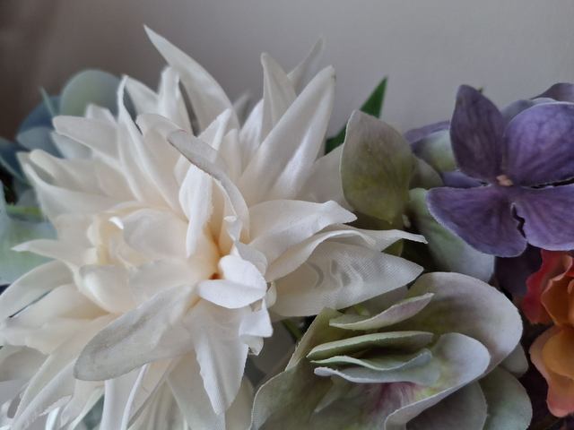 Le dahlia blanc nacré agit comme un trait d’union entre ces mondes, apportant une touche d’élégance subtile.