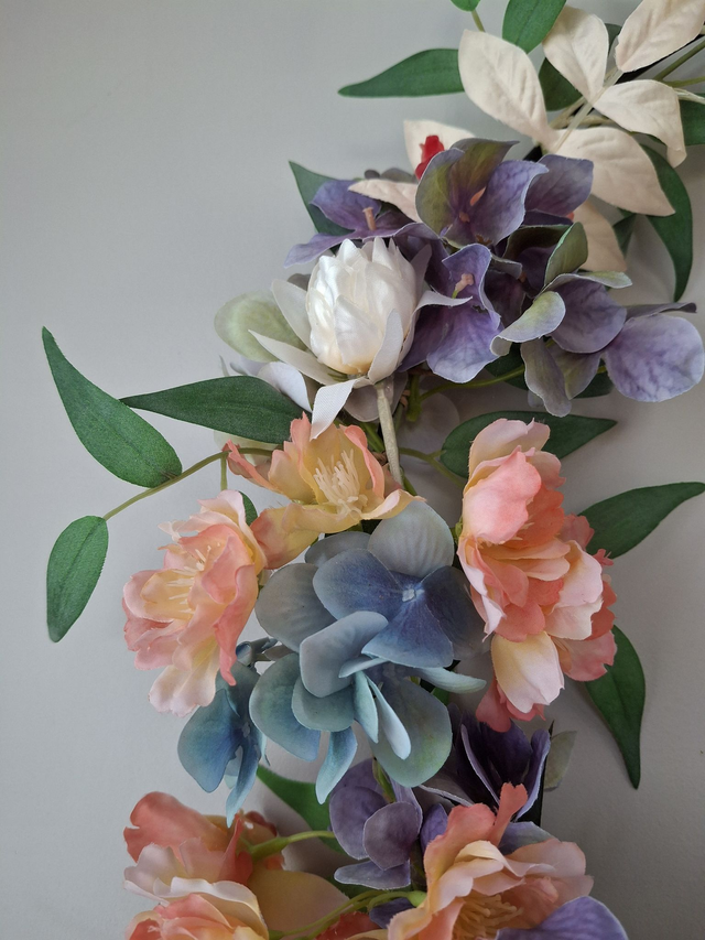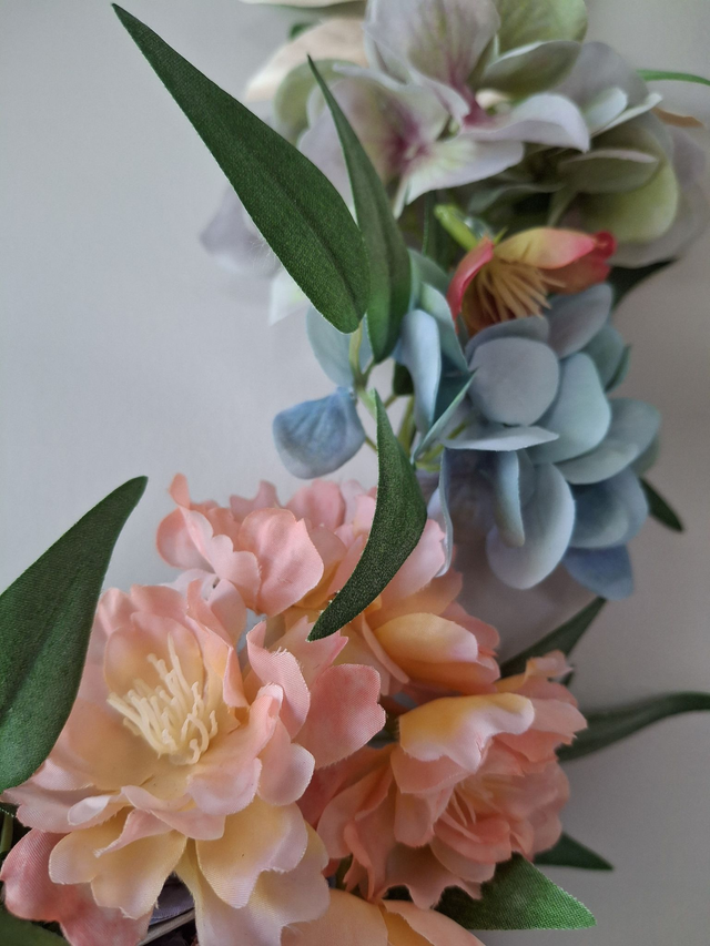 Couronne faite main en fleurs intemporelles mêle harmonieusement des teintes corail, pêche et bleu océan. Elle évoque les éléments de la nature : la chaleur de la terre, la fraîcheur marine et la douceur nacrée des coquillages.