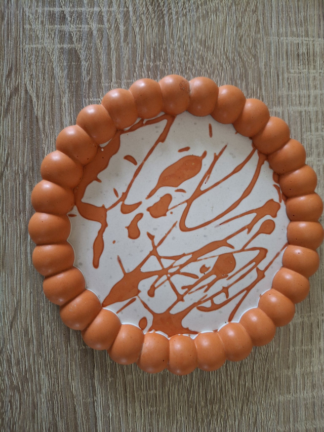 Ce grand plateau rond au design original attire le regard par son contraste unique : une bordure bombée d’un orange chaleureux qui encadre un centre moucheté, relevé de coulures éclatantes laissant le hasard faire les choses.